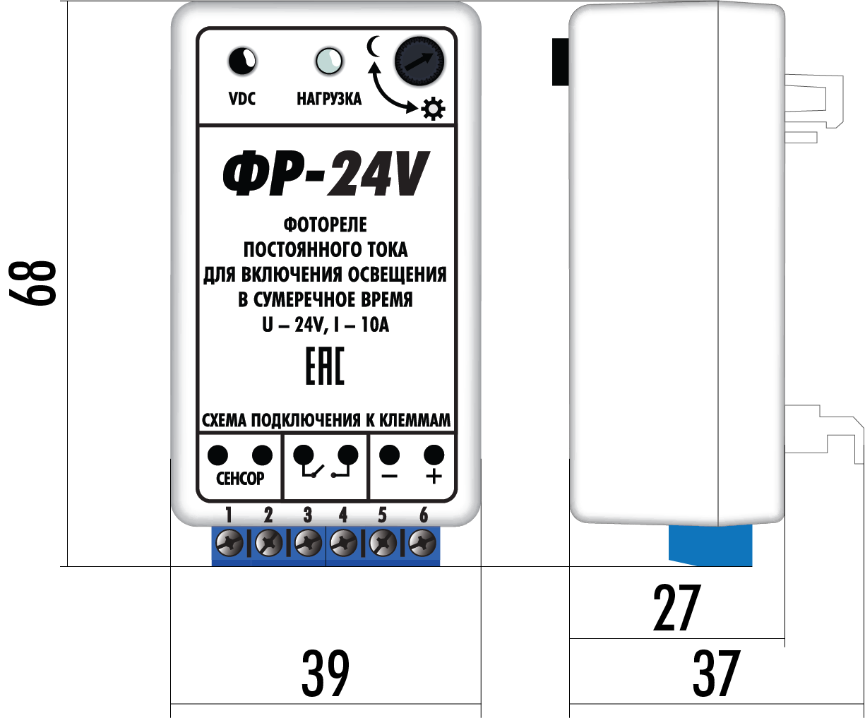 Фотореле выпускается в пластиковом корпусе с присоединением проводов питания, коммутируемых электрических цепей и гермосенсора на клеммы прибора.