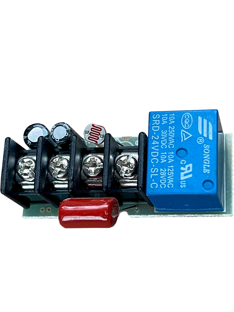 На плате установлена клемма питания и нагрузки, фоторезистор.